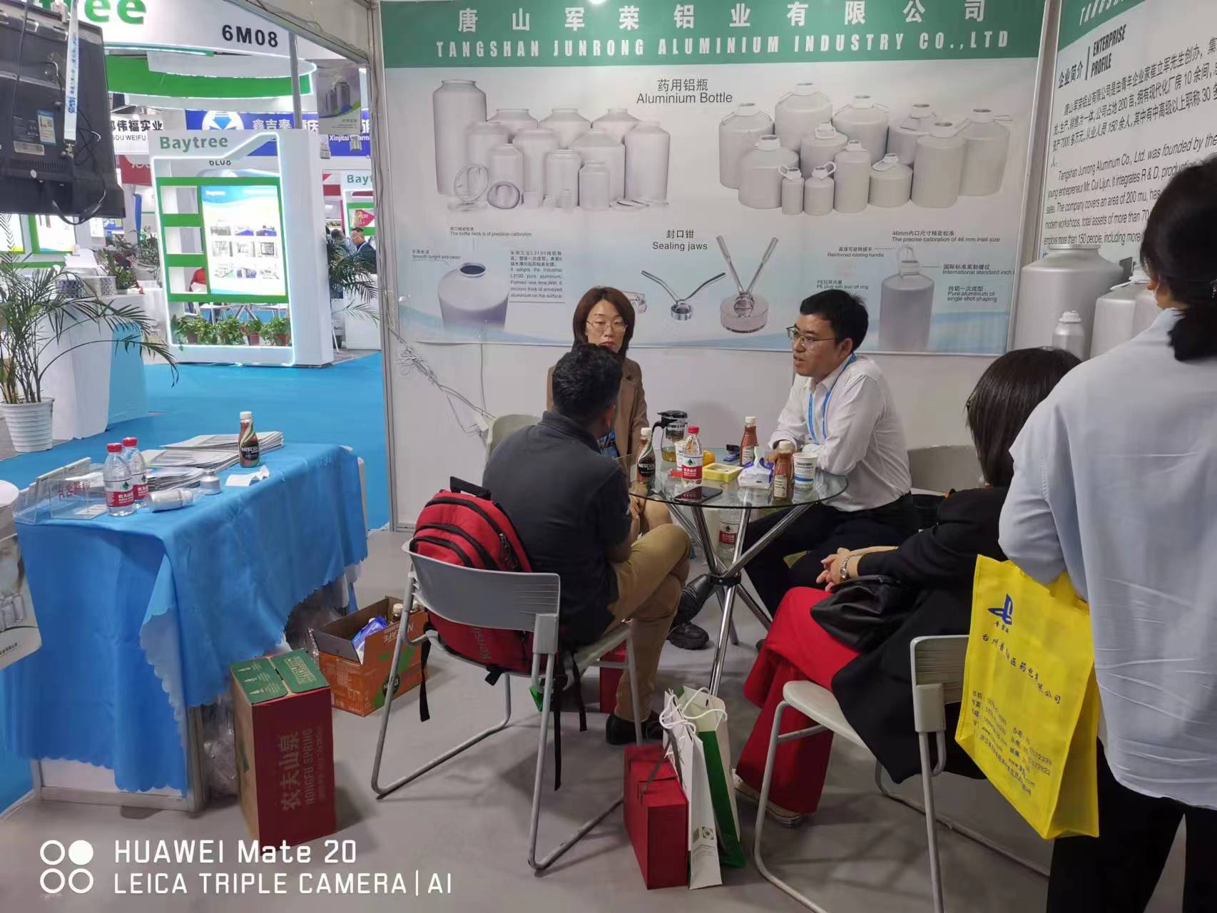 藥用鋁瓶鋁桶鋁聽廠家-唐山軍榮鋁業有限公司出席第89屆中國國際醫藥原料藥/中間體/包裝/設備交易會。展出產品50多種,涵蓋了固體和液體產品包裝中所需的鋁瓶,3個忙碌的日子中,幾百家客人來展位咨詢。